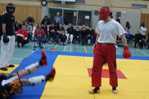 Johannes Schmitz räumt seinen Gegener ab, Kickbox-Wettbewerb bei den International FTU German Championship IV 2011